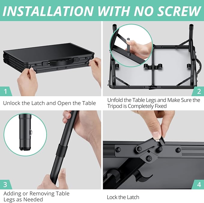 - DURABLE & STABLE CONSTRUCTION: Built with a high-quality aluminum alloy frame and a dense MDF desktop, this table is both sturdy and durable. The U-shaped frame and buckle design enhance stability, supporting up to 66 lbs, ensuring safety during use.