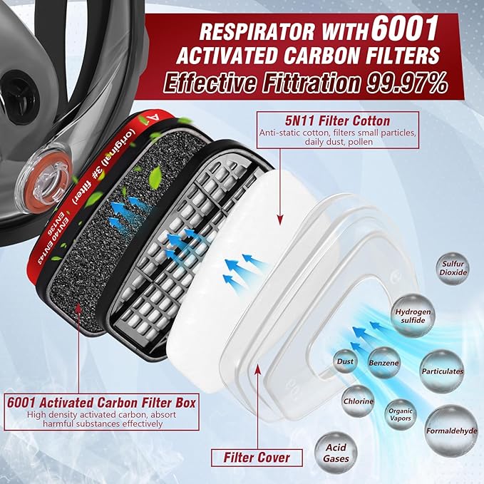 - [ 6001 Activated Carbon Filter ] - The full face respirator filters adopt double filter system (activated carbon filter and filter cotton). which can effectively block organic vapor, gas, chlorine, hydrogen fluoride, dust, non-oil and oil particulates.the protection efficiency is higher than 97%.