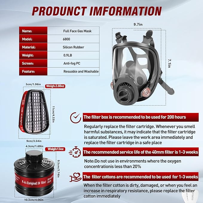- [ Wide Range of Uses ] - our full face gas mask adpots dual filtration system, which can block various harmful substances, which is suitable for work areas containing chemicals, metals, paint, formaldehyde, and other irritating vapors, and prevent dust particles generated by mechanical work such as welding, woodworking,sanding, polishing.