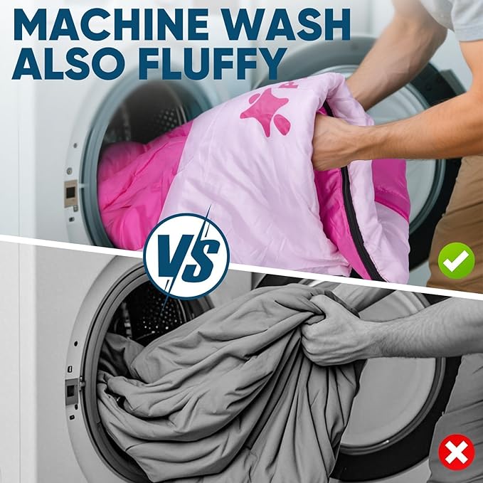 - Machine Washable: Crafted with double S-shaped stitching and Hollowfiber cotton filling, this sleeping bag is both water-resistant and windproof; The spun cotton inner lining ensures softness and warmth, maintaining its thermal efficiency even after machine washing without clumping