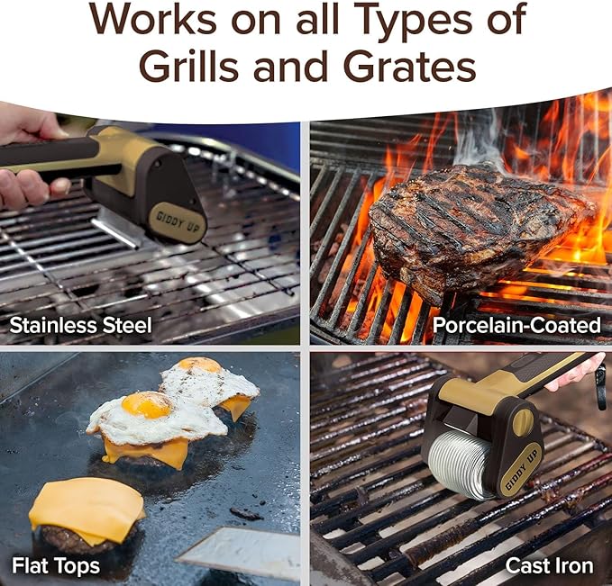 - CORDLESS & RECHARGEABLE: Giddy Up is cordless and rechargeable, ensuring you can clean your grill anywhere, anytime