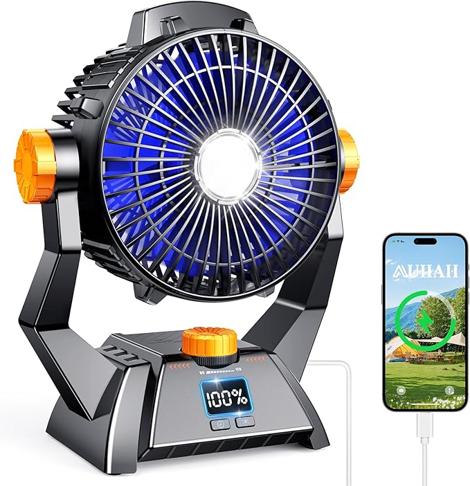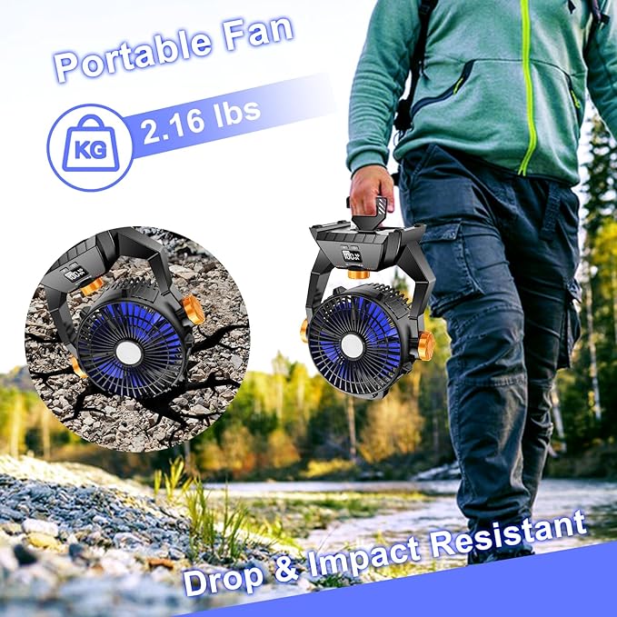 - 【 Lightweight Camping Fan with LED Light 】 Portable fan for camping with compact design and lightweight build make it easy to carry, while the integrated LED Lantern provide versatile illumination during camping nights and power outage or at any other time you need. Rechargeable fan camping also function as power banks, allowing you to charge your phone and other electronic devices on the go! It's an excellent camping accessories for outdoor activities such as camping, hiking, or picnic.