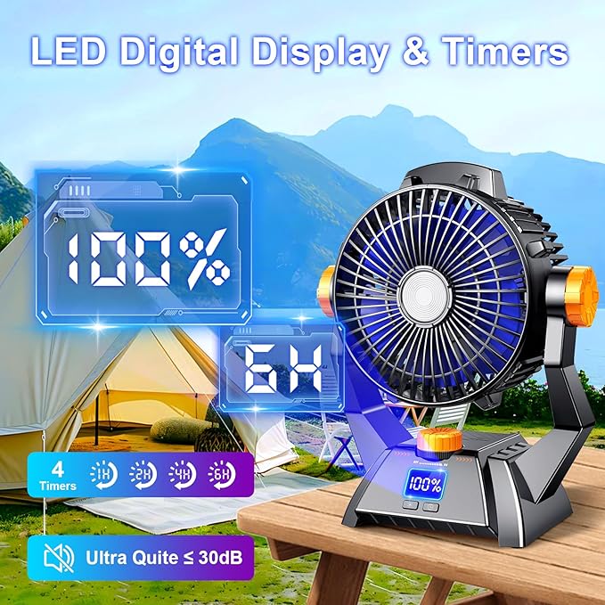 - 【 Stay Cool Wherever You Go 】 Usb fan camping with the LED display, you can easily check the remaining battery and timer at any time, no more battery anxiety. This portable camping fan great for cooling and can be used both indoors and outdoors. Such as camping, fishing, hiking, road trip, rv, bedroom, office, power outage and so on. It's a life saver for during the summer. Beat the heat with this gadget!
