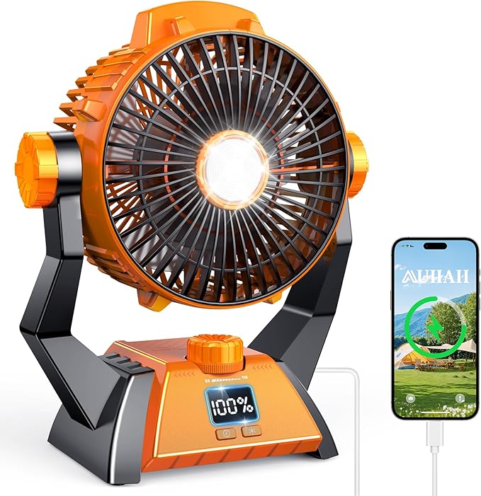 - 【 Lightweight Camping Fan with LED Light 】 Portable fan for camping with compact design and lightweight build make it easy to carry, while the integrated LED Lantern provide versatile illumination during camping nights and power outage or at any other time you need. Rechargeable fan camping also function as power banks, allowing you to charge your phone and other electronic devices on the go! It's an excellent camping accessories for outdoor activities such as camping, hiking, or picnic.
