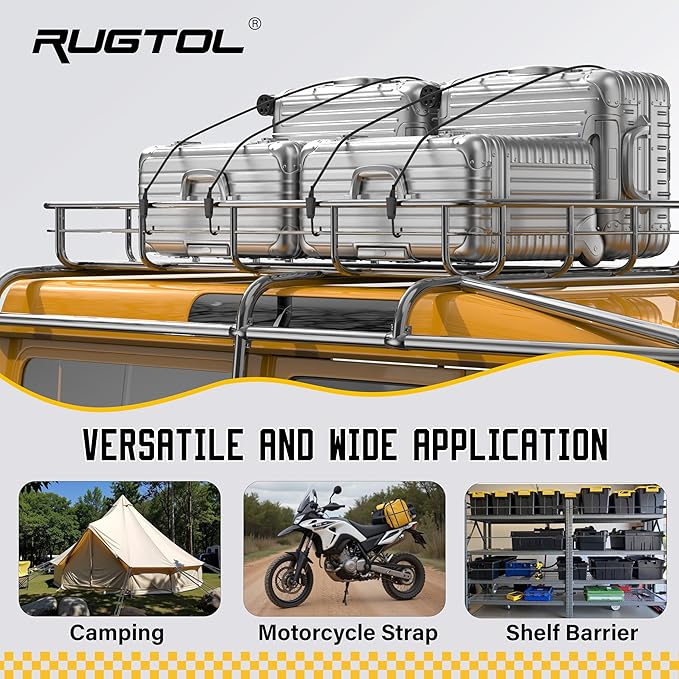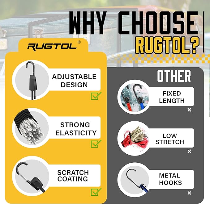 - Easy to Adjust Design Bungee Cords: Rugtol bungee cords are crafted with a premium blend of natural rubber and Thai latex, delivering exceptional elasticity that stretches up to twice their original length without compromising strength. The innovative adjustable mechanism makes it quick and easy to modify the length to suit your needs, eliminating the frustration of fixed-size cords.
