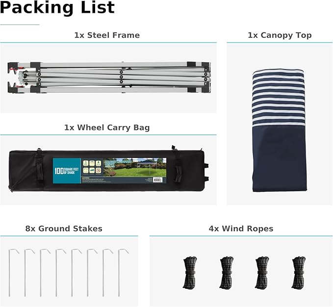 - Spacious Shelter Design: 10X10 pop up canopy provides 100 square feet of cooling shade, providing ample shelter for more than 10 people,Three different height settings allow you to pick the height that best suits your needs, Great for camping, picnic, barbecue, party and other outdoor events