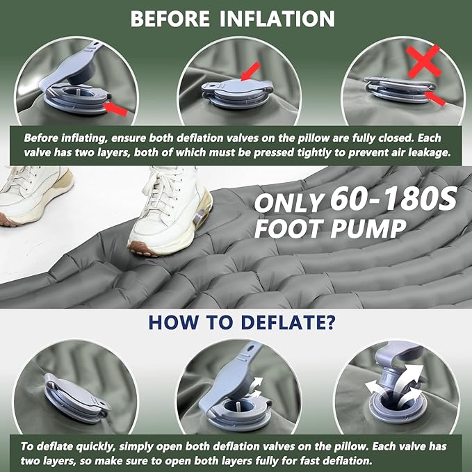 - 【Fast Foot Pump to Inflate & 1s Deflation】No need for hands, mouth, or a pump to inflate our self-inflating camping sleeping pad. Simply step on the built-in foot pump, and it will fully inflate in 1-3 minutes. Additionally, the two dual-layer valves on the pillow of the air mattress effectively prevent air leakage and allow for quick deflation. Note: Be sure to close the two valves on the back of the pillow before inflating.