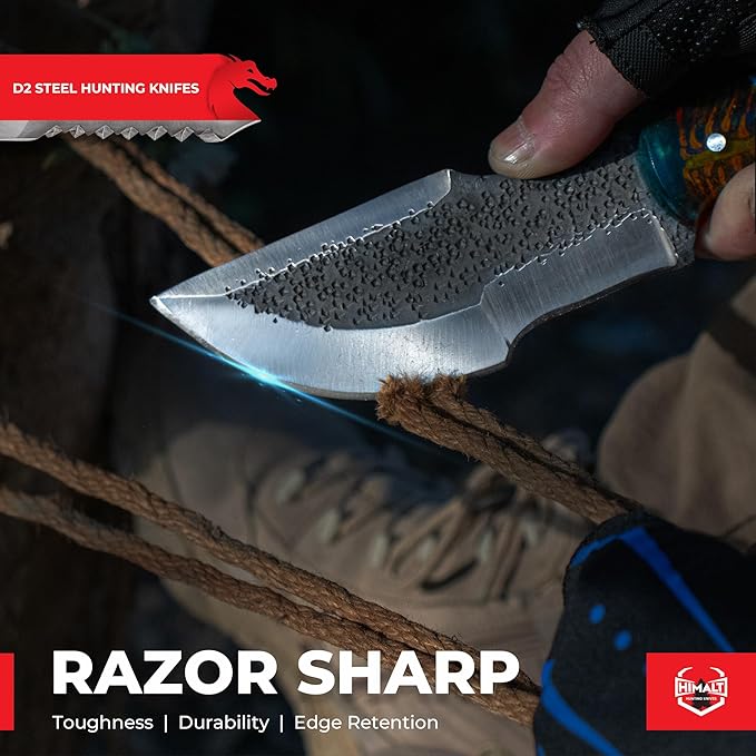 - EDC knife : Himalt fixed blade D2 steel knife is indeed a piece of art made by skilled knife maker. Comes with a sturdy leather sheath with integrated belt loop and snap lock to ensure safe carrying.