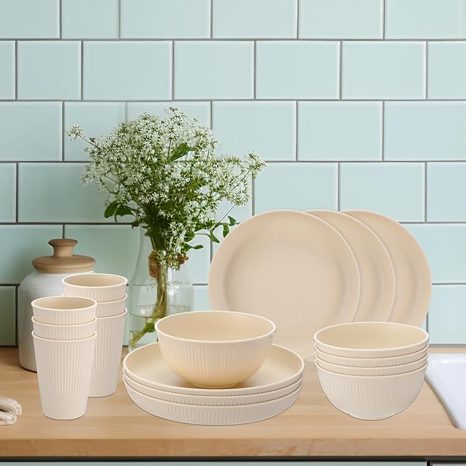18PCS Wheat Straw Dinnerware Sets Unbreakable Dinnerwares Sets Reusable Cups Plates and Bowls Sets Microwave Dinnerware Sets for Kitchen Travel Camping