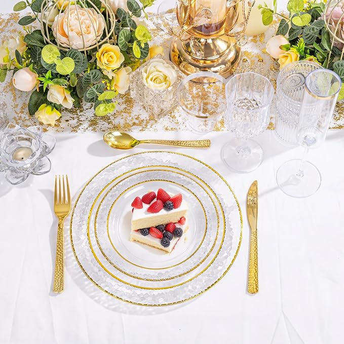 - Perfect For Any Occasion: These clear gold plates can be used in Thanksgiving, Weddings, Formal Dinners, Parties, Graduations, Anniversaries, Picnics, Catered Events, and All Occasions! You can enjoy your events without worry about to wash the gold plates.