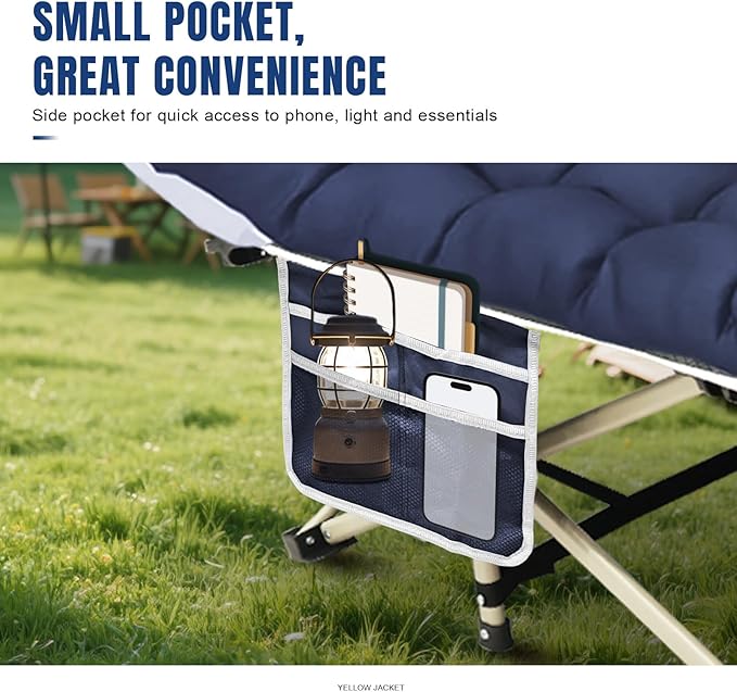 - Versatile cot camping with Storage: This folding cot bed features a large side pocket for phones, glasses, and essentials. Perfect for families and outdoor use, it's ideal for Camping, beach trips, Office naps, patio lounging, Road trips, travel. The compact foldable design with storage makes relaxation convenient anywhere.