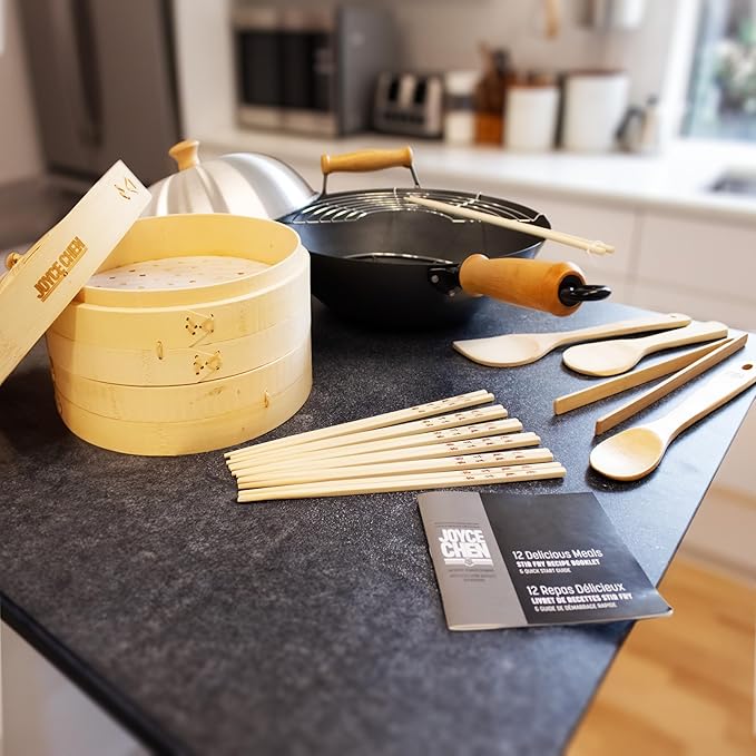 - Includes Professional Series 14-inch PFAS-free nonstick wok, 10-inch bamboo steamer basket, wok lid, tempura rack, bamboo spatula, spoon, tongs, rice paddle, cooking chopsticks, 6 pairs of table chopsticks, steaming rack, recipe booklet, and steamer papers