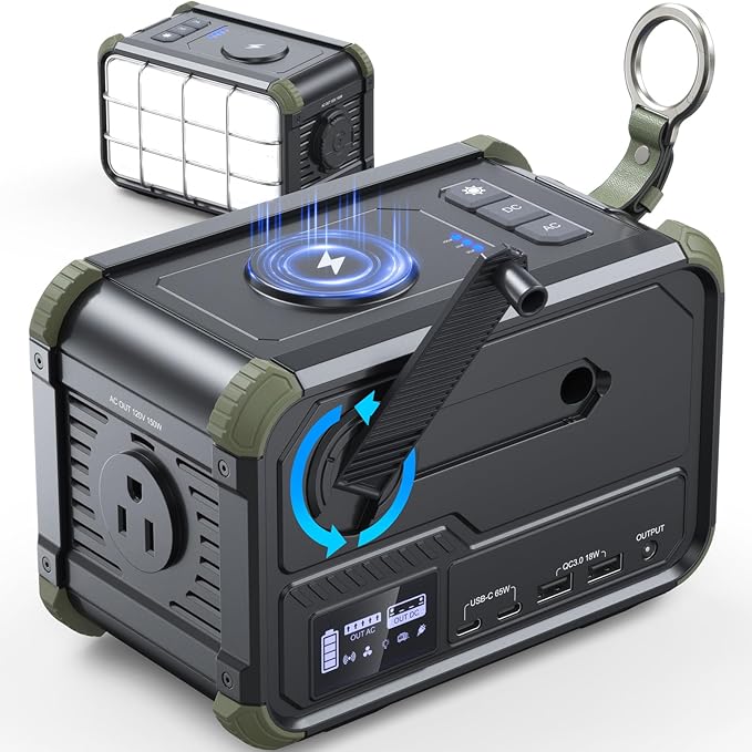 - Efficient Multi-Source Charging: Recharge via wall outlet, solar panel, or hand-crank. Achieve 0-100% charge in approximately 3 hours using a PD60W adapter or a solar panel over 100W. (The hand-crank is designed for emergency use only), providing 5 minutes of emergency lighting with just 1 minute of cranking at 2 RPM. While recharging the power station, you can simultaneously charge other devices. This electric generator is perfect for outdoor adventures, home emergencies, and off-grid living, with solar powered generator compatibility for eco-friendly charging. Ideal for off-grid and backup power needs.