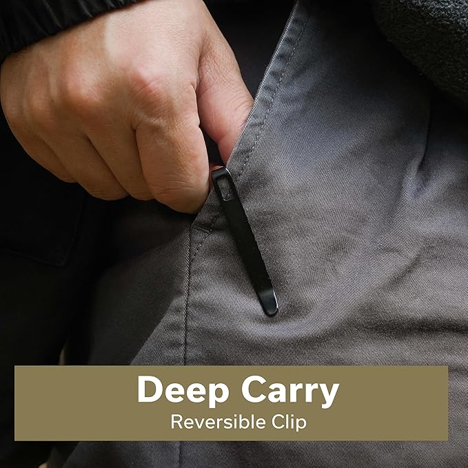 - Reversible Clip: A low-profile deep pocket carry clip is provided that can set up for left or right hand carry