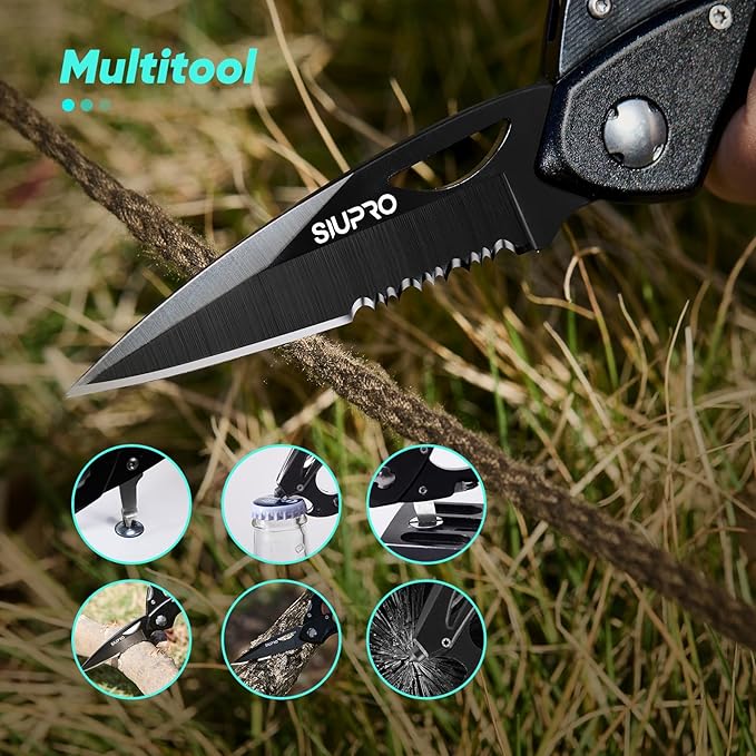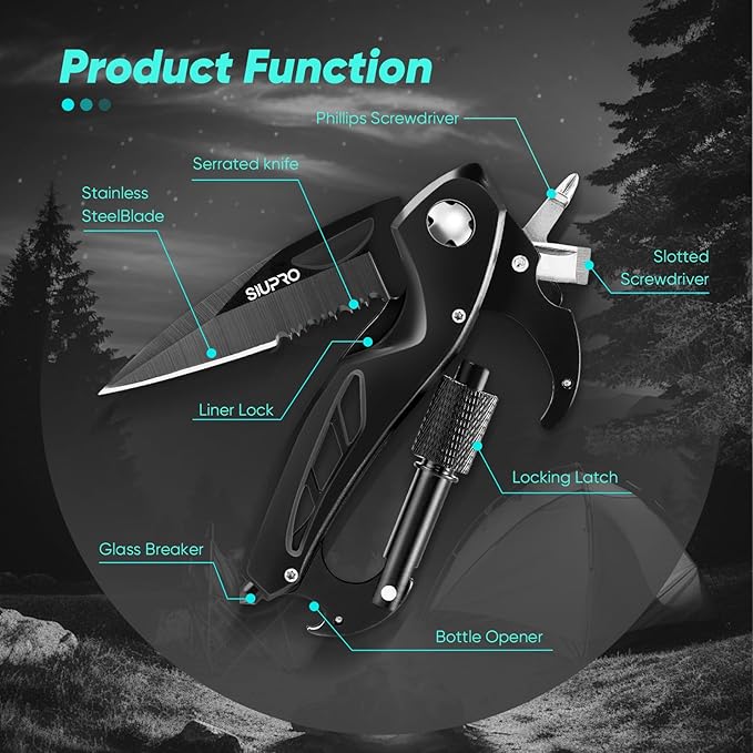 - Multi-functional: This multi tool EDC includes a folding pocket knife with serrated blade, a bottle opener, a glass breaker for emergency situations, a Phillips screwdriver, a flat screwdriver, a carabiner clip for outdoor and everyday daily carry