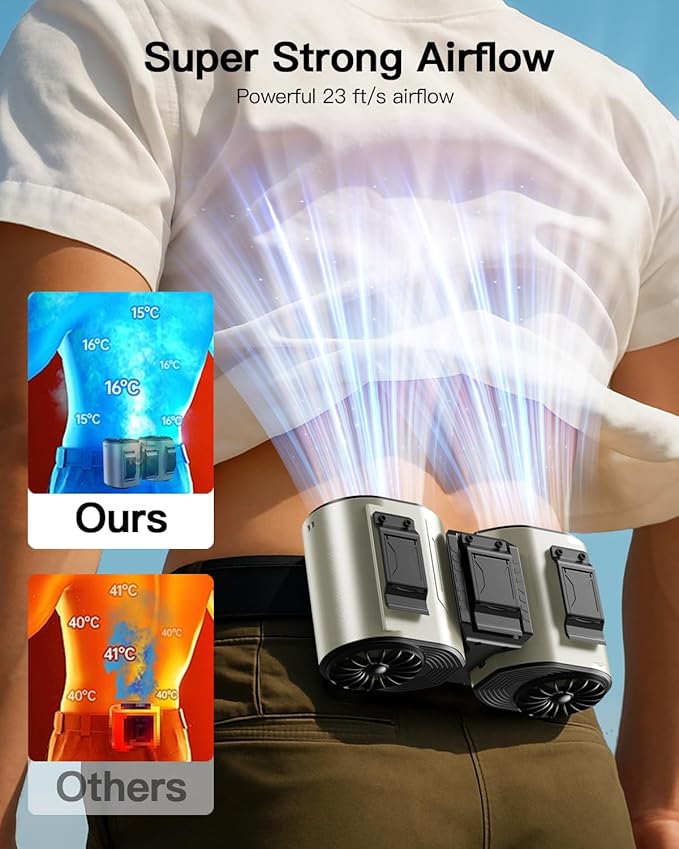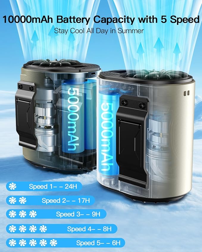- 【Cool All Day, Every Day】Equipped with a 10,000mAh battery (two 5,000mAh units), this portable waist fan provides up to 6 hours on high or 24 hours on low. Recharges in 4-5 hours via Type-C, with a smart LED indicator to keep you informed