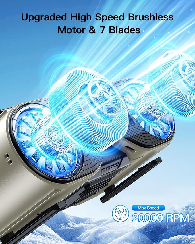 - 【Powerful & Refreshing Cooling】Powered by a high-performance brushless motor (up to 20,000 RPM) and sleek propeller-style blades, this portable neck fan delivers strong, refreshing airflow through an advanced grille. Crafted with reinforced materials, its durable blades ensure long-lasting performance you can rely on