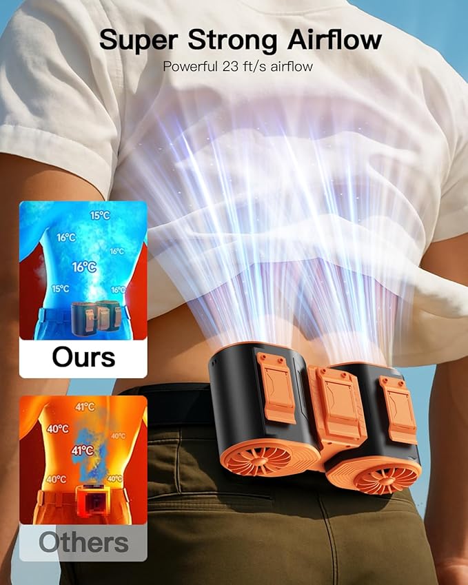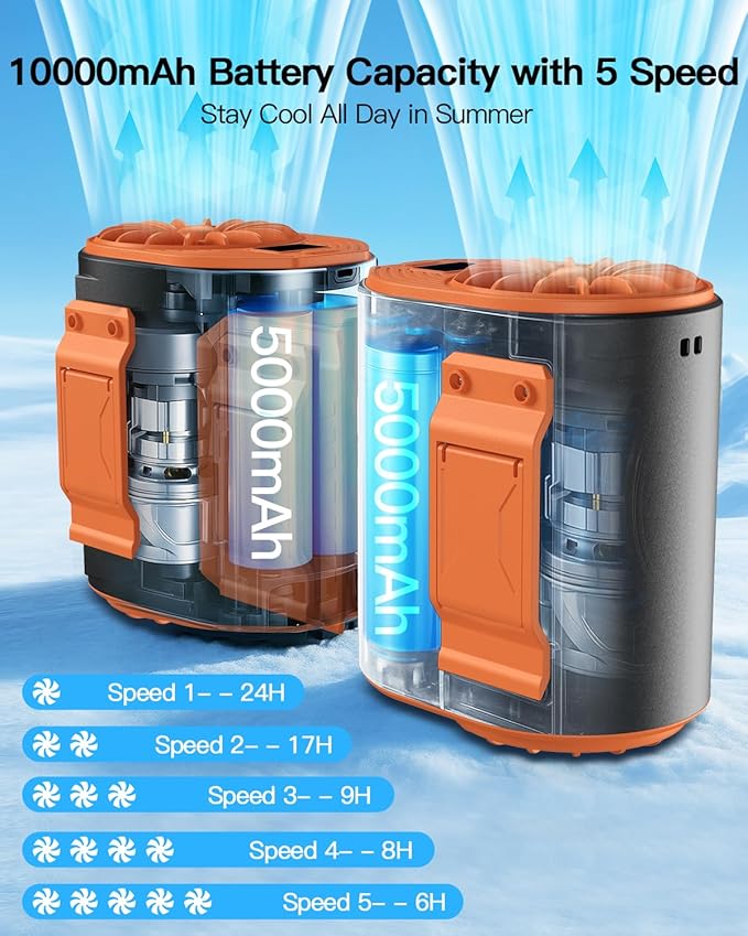 - 【Cool All Day, Every Day】Equipped with a 10,000mAh battery (two 5,000mAh units), this portable waist fan provides up to 6 hours on high or 24 hours on low. Recharges in 4-5 hours via Type-C, with a smart LED indicator to keep you informed