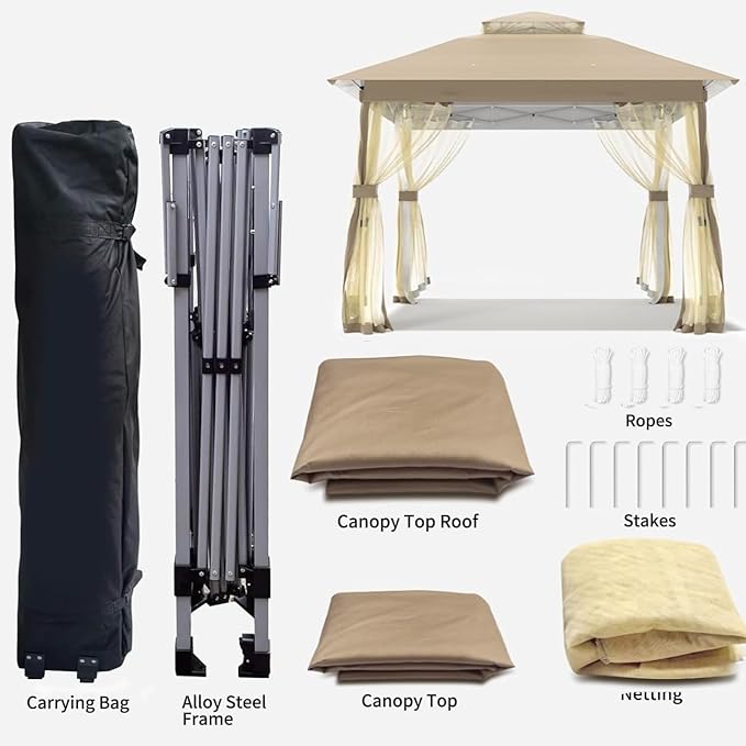Auraway Instant Pop-Up Gazebo with Mosquito Net and Waterproof Double Roof - for Camping, Beach, Backyard; Easy Setup; Sun Shade with UV Protection (Chocolate) (13X13) (Light Beige, 11 * 11)