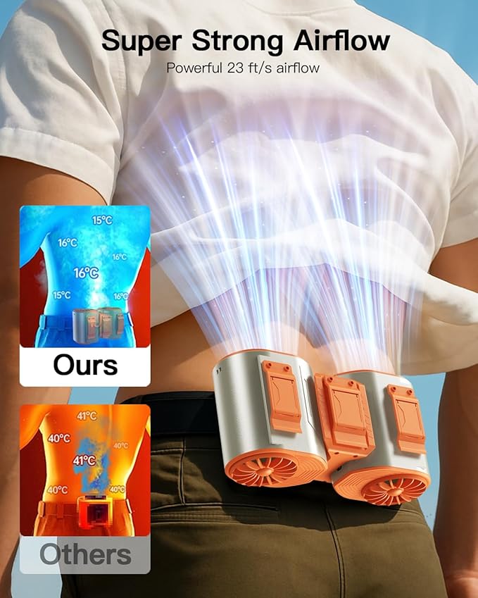 - 【Cool All Day, Every Day】Equipped with a 10,000mAh battery (two 5,000mAh units), this portable waist fan provides up to 6 hours on high or 24 hours on low. Recharges in 4-5 hours via Type-C, with a smart LED indicator to keep you informed