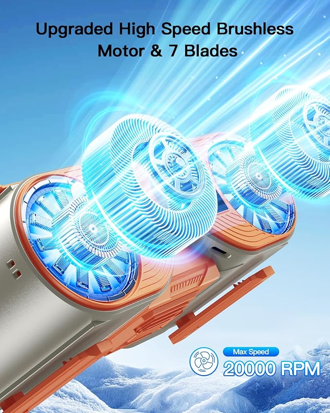 - 【Powerful & Refreshing Cooling】Powered by a high-performance brushless motor (up to 20,000 RPM) and sleek propeller-style blades, this portable neck fan delivers strong, refreshing airflow through an advanced grille. Crafted with reinforced materials, its durable blades ensure long-lasting performance you can rely on