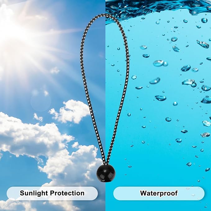 - [Durable Tie Down Cords] - The cord is made of high strength and is coupled with a sturdy plastic ball for outstanding durability and weather resistance. The plastic material will not rust, ensuring long-lasting performance in outdoor conditions
