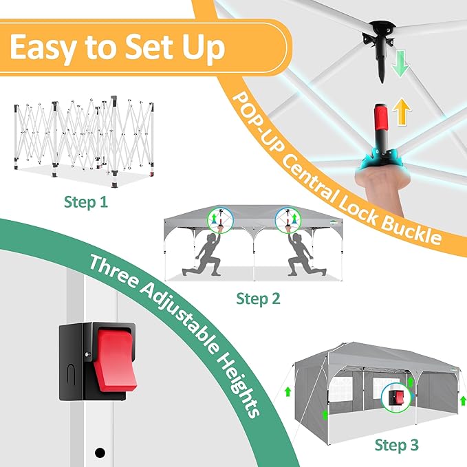 - 1. Instant 10x20 Pop Up Canopy Quick-Setup: Zero Tools Needed! Enjoy hassle-free assembly with COBIZI's one-click center-lock patented technology for canopy tent 10x20. Designed for quick deployment, our outdoor awnings come with a pre-assembled frame that unfolds like an umbrella and can be deployed in less than 15 minutes.No missing parts or tools required.