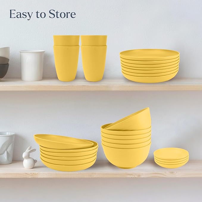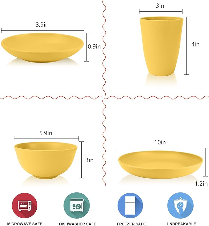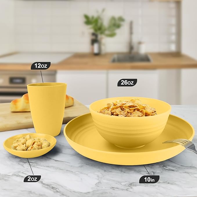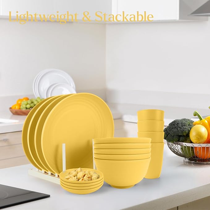 Wheat straw plates and bowls sets of 16 - Unbreakable wheat straw dinnerware sets for camping - Alternative plastic dinnerware set service for 4. Yellow