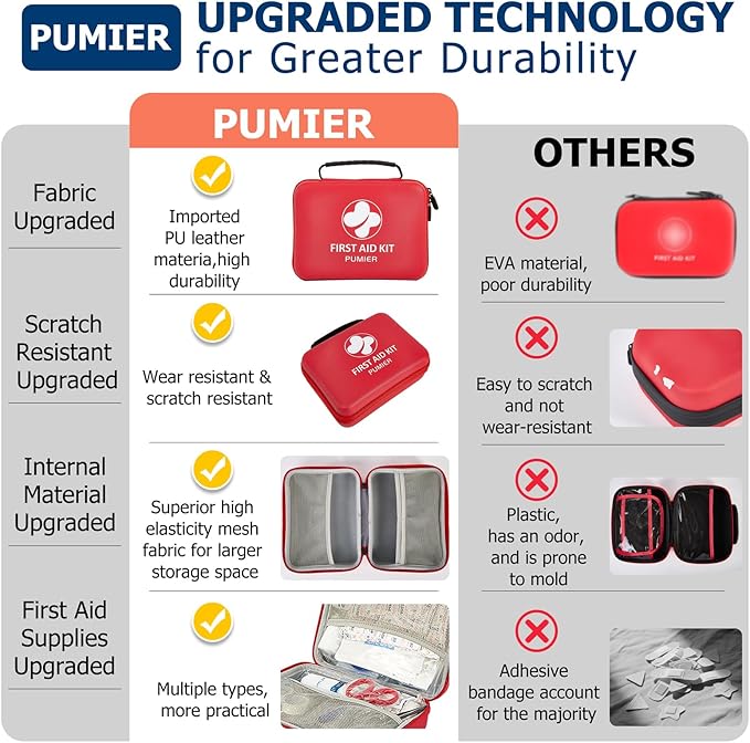 - ✅【Durability & Hard Case】- Made from lightweight yet rugged shell construction with durability PU leather exterior, this first aid kit is shockproof, water-resistant, and easy to clean, ensuring long-lasting durability for home, travel, worksite, car, office, school, dorm, road trips, hiking, sports, backpacking, or wilderness adventure, outdoor adventures. The sturdy design ensures complete protection for first aid supplies inside, effectively shielding contents from impacts and preventing crushing or damage during transport and harsh conditions.