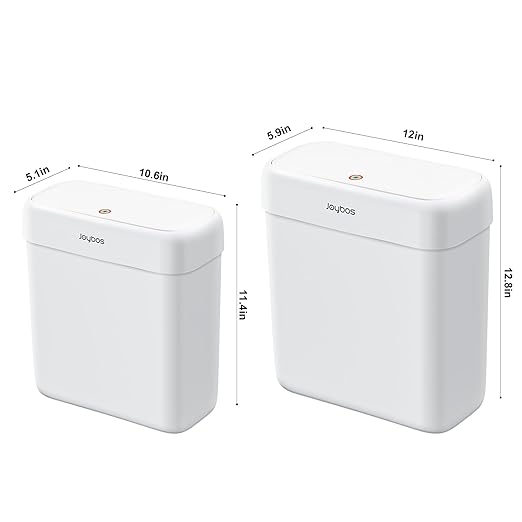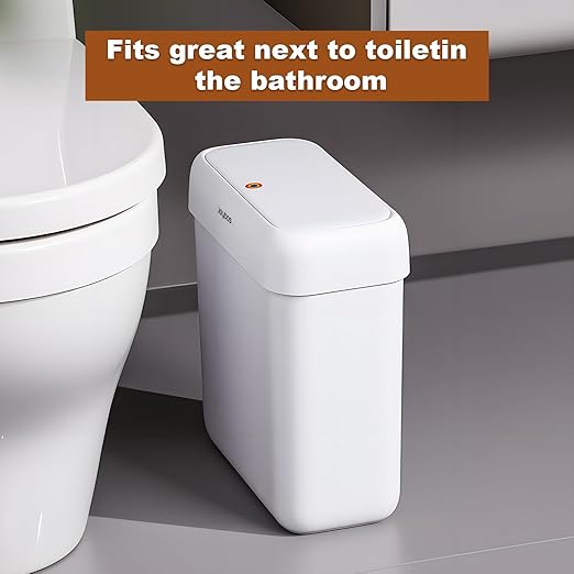 - Small Enough to Fit: The compact design of this trash can make it ideal for small spaces. The slim feature makes it fit perfectly between vanity and toilet, that it fit so well in such a tight squeeze!dimensions of 10.6*5.1*11.4 inch &12*5.9*12.8 inch