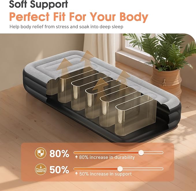 - 【Enhanced Thickness & Anti-Slip Base】Crafted from eco-friendly, durable material that’s 30% thicker than standard options, this air mattress twin with built in pump is designed to resist punctures and leaks, even from playful pets. The anti-slip base keeps the inflatable mattress firmly in place, reducing noise and ensuring a peaceful, quiet sleep