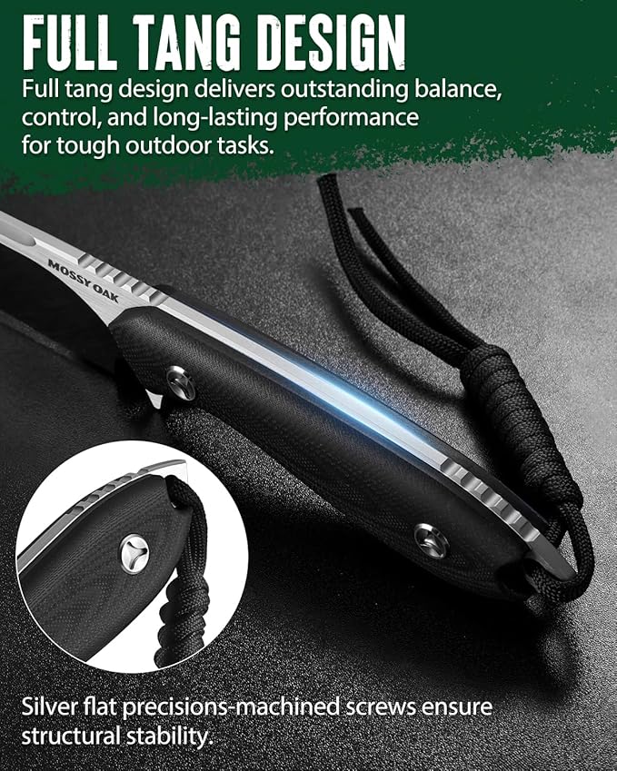 - Full Tang Design: This 8.75-inch fixed blade knife features a one-piece full tang design that ensures superior strength, balance, and reliability, even during tough survival and bushcraft use
