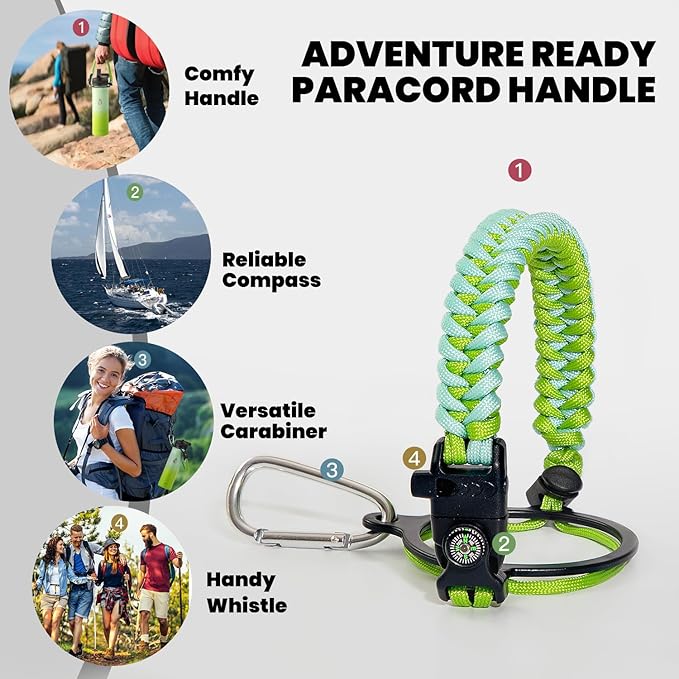 - Iconic Paracord Handle: This insulated water bottle comes with a beautiful hand knit nylon paracord in coordinated color with the water bottle. Configured with a compass and carabiner, this paracord handle is a must-have as a full functional camping / hiking flask