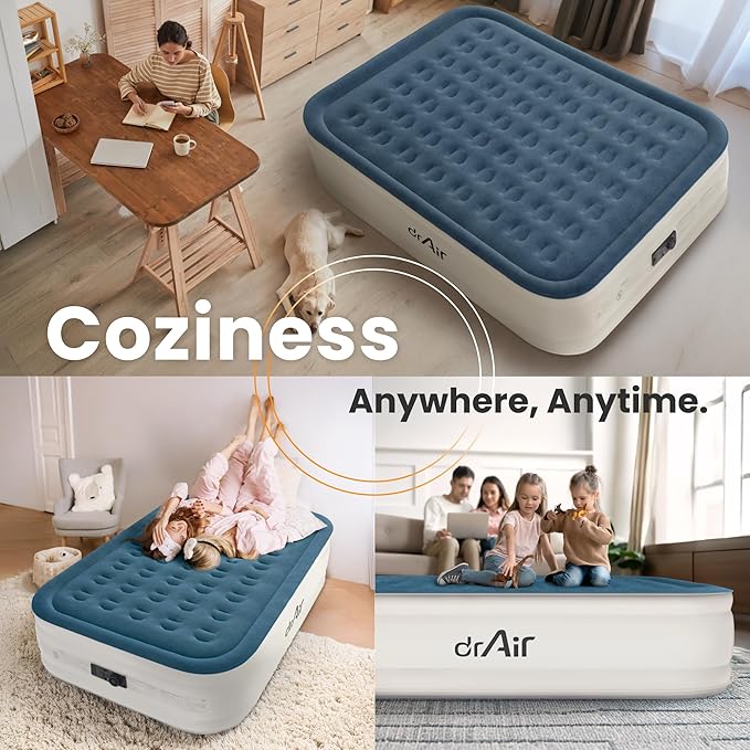 - 【UPGRADED BUILT-IN AIR PUMP】Dr. Air King-sized air mattress inflates 31% faster and 50% noise-reducing than similar products with an upgraded built-in electric pump, taking just 2-3 minutes. Its upgraded design offers quick, reliable performance while effectively minimizing leaks and 1-click inflation and deflation.(Compatible with 110V)