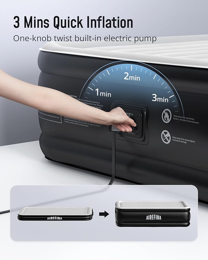 - Built-in Electric Pump: Just plug in the power, knob the built-in air pump, air mattress queen with built in pump is easy to automatically blow up under 3 minutes.