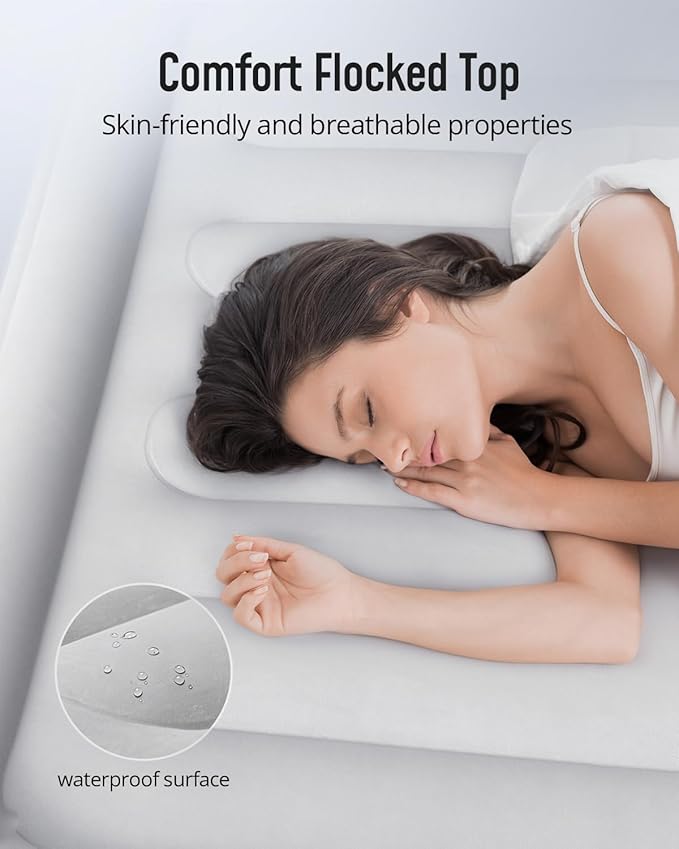 - Comfort Sleep: Queen air mattress with built in pump has flocked top not only skin-friendly but also waterproof, meanwhile, non-slip bottom provides blow up mattress queen more stable and reduces noise.