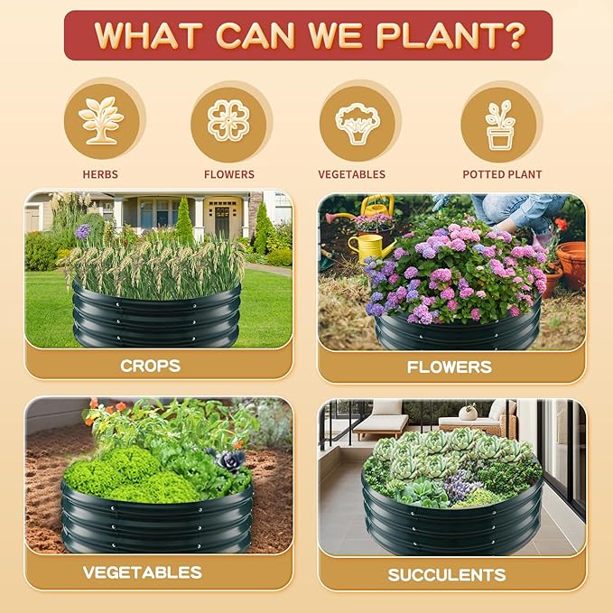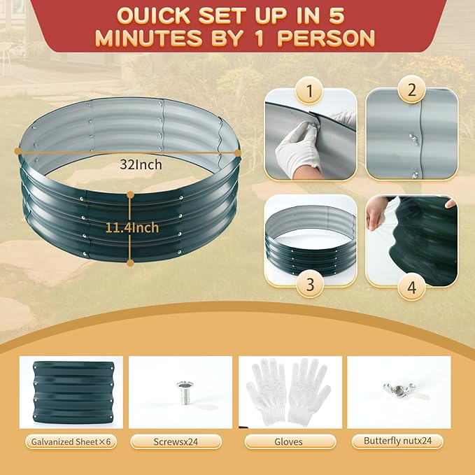 - 【DURABLE & STABLE】: ZBZBML round raised garden bed (2.7×2.7×1ft) is 32 IN Diameter,11.8IN Tall, each is made of 0.8MM thick Q195 galvanized metal sheet painted, double-layer anti-corrosion galvanizing and round structure design,it is built to providing a solid foundation for your plants.