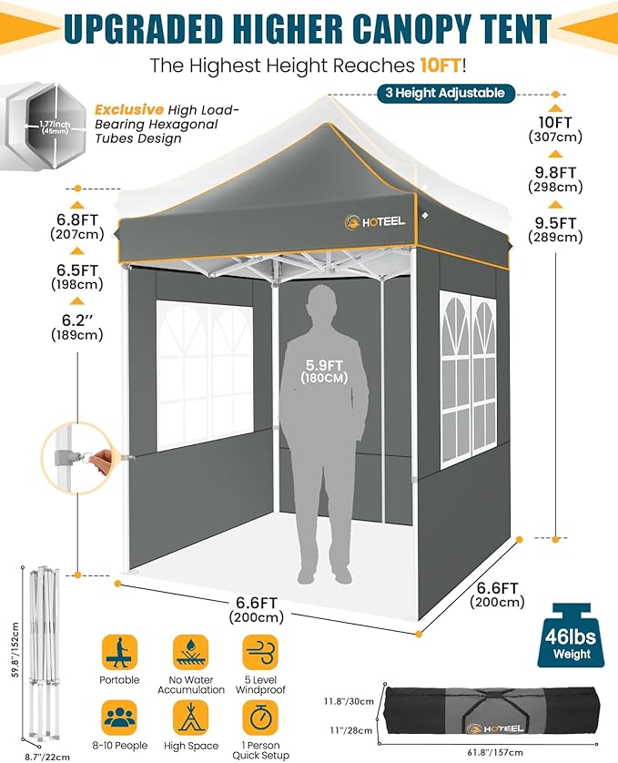 - QUICK SETUP, 3 HEIGHTS AVAILABLE: Canopy tent 6.6x6.6 can be quickly installed by 1-2 people in minutes without tools. Large pop up canopy with sidewalls enough to accommodate 8-10 people easily. Adjust 3 different heights (124 inches, 130 inches, 134 inches) with the upgraded pull ring. It is easy and smooth to lock and release, to prevent pinched fingers