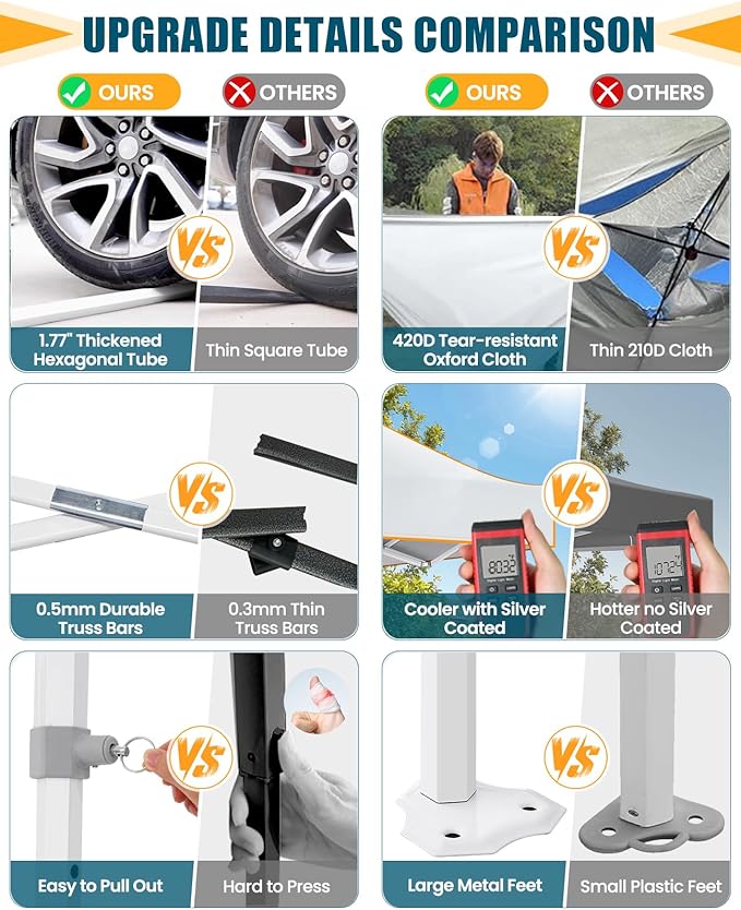 - UPGRADE THICK HEXAGONAL PIPE HEAVY DUTY CANOPY FRAME: Hoteel 6.6x6.6 Heavy Duty Pop Up Canopy Tent is made of a commercial-grade full truss structure, durable and rustproof. Upgrade hexagonal pipe, more stable than square pipe, which diameter is 1.77'' (45mm) and the wall thickness is 0.03'' (0.7mm), while most 6.6x6.6 party tent are only 0.98'' in diameter and only 0.02'' thickness. HOTEEL 6.6x6.6 pop up tent can withstand up to level 5 wind / 28-38 mph