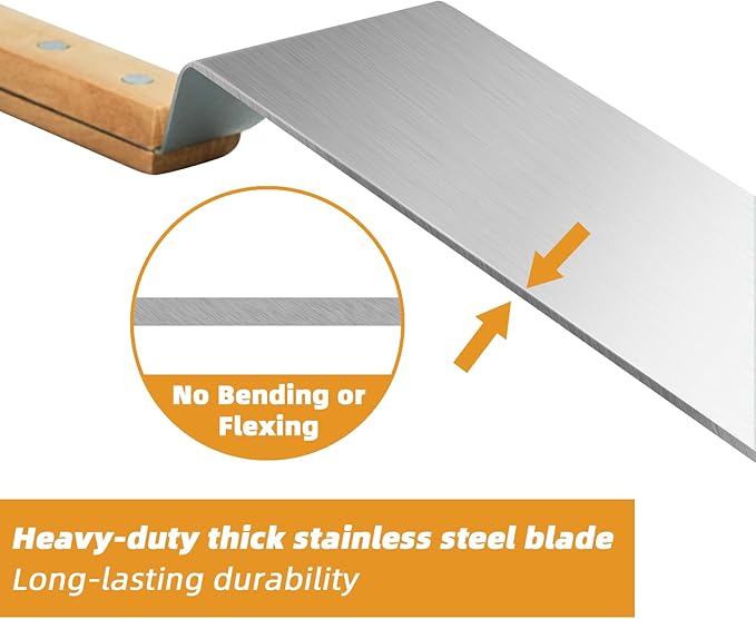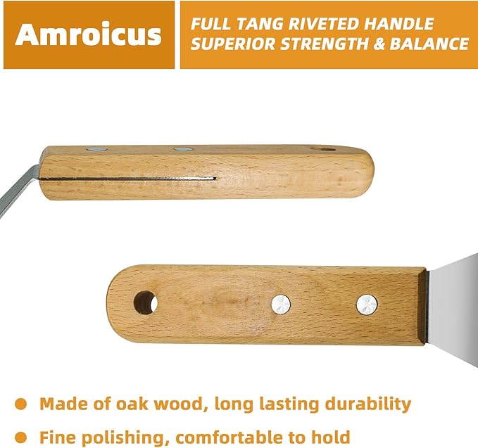 - Comfortable Full Tang Wood Handles: Each tool features a solid wood handle with double rivets for secure attachment and added durability. The full tang design ensures balance and strength for confident flipping, smashing, or scraping, without worrying about loose handles.