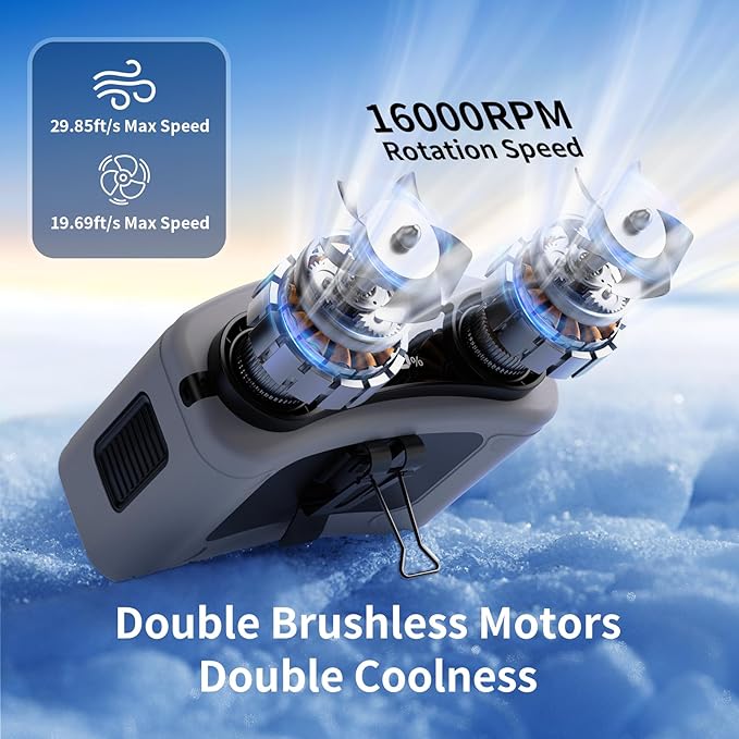 - 【10 Levels Power Wind with Dual Motors】The cooling fan features dual high-speed brushless motors with a max speed of 16000 RPM, airflow up to 29.85ft/s, and air supply distance up to 8.2ft. With 10-gear adjustable wind speeds ranging from natural to strong and double air outlets for double cooling, this waist fan is ideal for outdoor construction workers, farmers