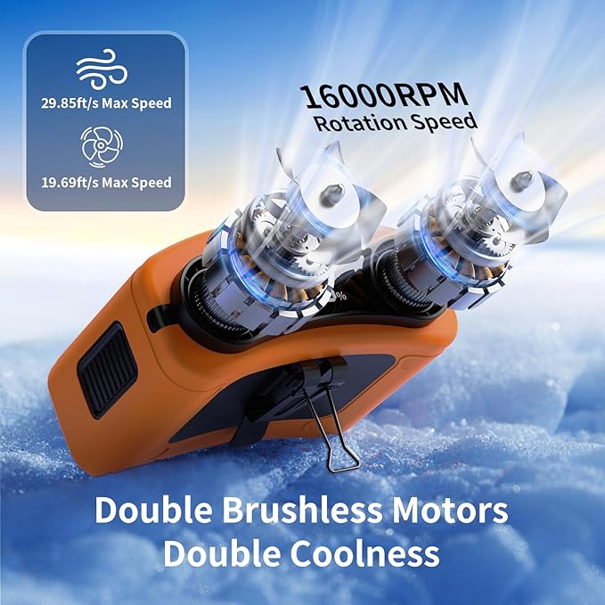 - 【10 Levels Power Wind with Dual Motors】The cooling fan features dual high-speed brushless motors with a max speed of 16000 RPM, airflow up to 29.85ft/s, and air supply distance up to 8.2ft. With 10-gear adjustable wind speeds ranging from natural to strong and double air outlets for double cooling, this waist fan is ideal for outdoor construction workers, farmers