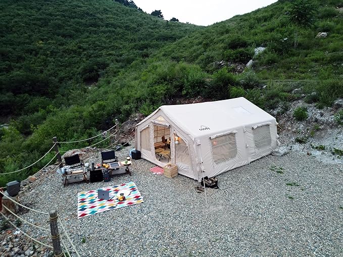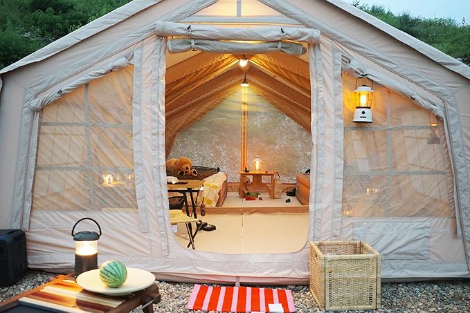 - Waterproof and Windproof inflatable tent with stove jack: The luxury tent 4-season big tents for camping, with a stove hole, handles rain, wind and sun. Best inflatable tent ideal for summer, spring, and fall, it stays cozy above 32°F (0°C). For heavy rain, use the included rain fly.