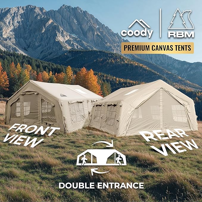 Coody | Rbm Outdoors Koala/Hub/Octopus Inflatable Tents for Camping with Stove Jack, 2/8/10 Person Luxury Canvas Blow Up Tent, 2 Room, Easy Setup Casa de Campaña, Large Inflatable House with Pump