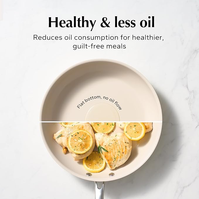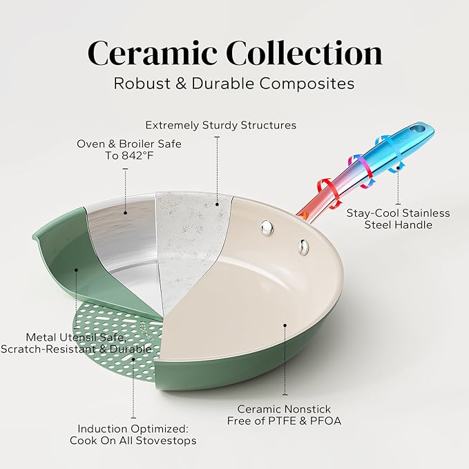 - COOL & STURDY HANDLE: Crafted from lightweight, precision-pressed stainless steel, this ergonomically designed handle ensures a comfortable grip. Double-riveted for exceptional strength and maneuverability, ceramic saute pan empowers you to seamlessly transition from stovetop to oven, allowing you to achieve that flawless sear, brown toppings, or even bake