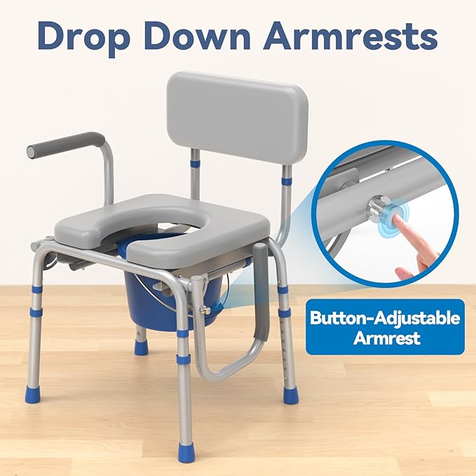Drop Arm Bedside Commode, Commode with Padded Seat and Backrest, 500lbs Capacity, 5.81QT Removable Bucket, Adjustable Height Portable Toilet for Adults, Gray