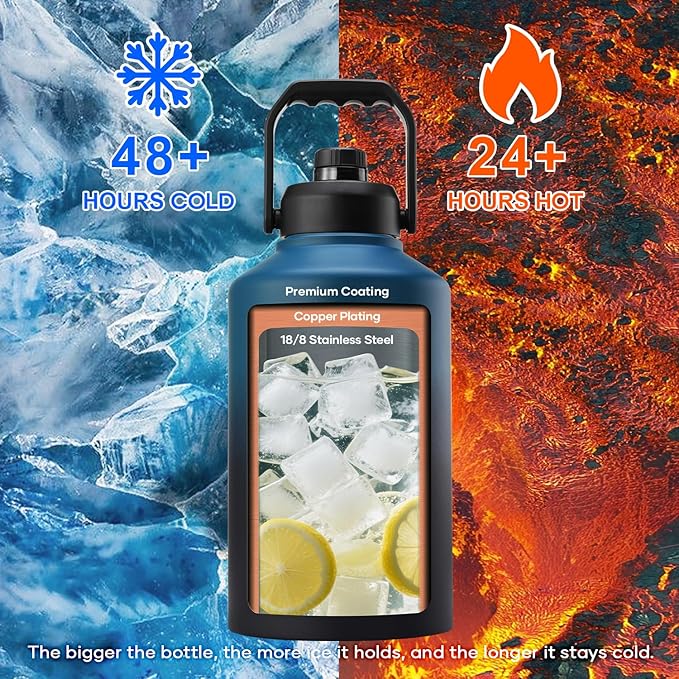 - Ice Cold for Days: With our ThermoArmour technology and triple-layer vacuum insulation, our gallon water bottles lock in chill for 48+ hours and keep drinks hot for 24+ hours. Pro tip: the bigger the bottle, the more ice it holds, and the longer it stays cold