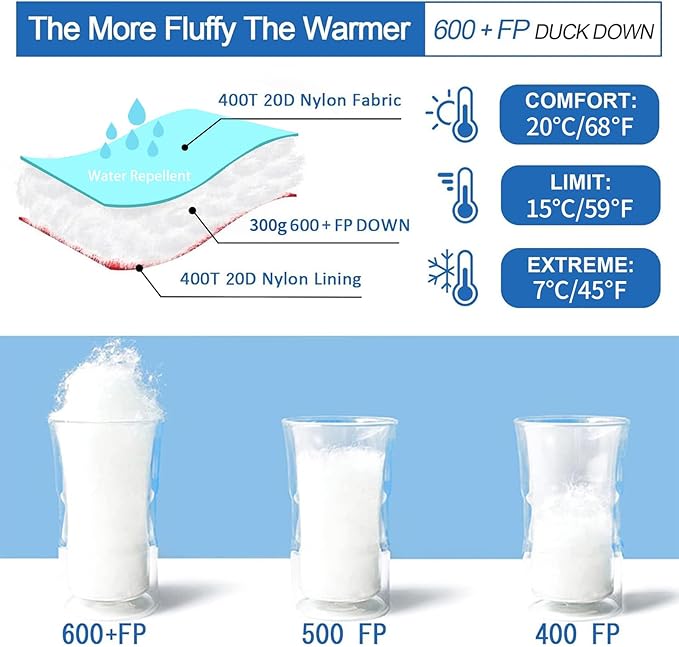 - Keep Warm: Backpacking sleeping bag Filled with 0.66lbs 600 FP premium duck down, comfort temperature 59°F-68°F, limit 45°F. Double zipper design prevents cold air, added chest insulation for better warmth