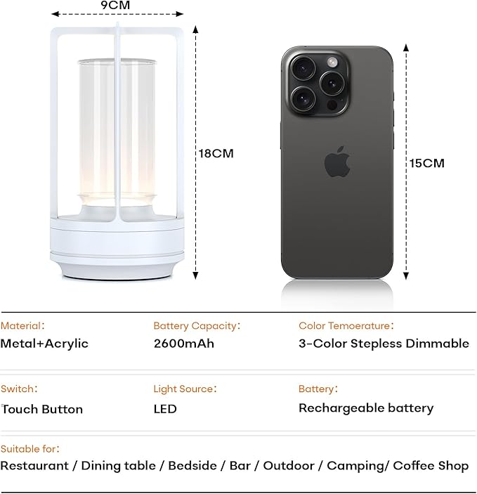 - ๐ [ A perfect gift idea ]: Our touch light lamp can match a variety of scenes and styles while making a great gift. It can be used as an ambient light for Thanksgiving, Christmas and birthday parties. The rechargeable cordless led table lamp is suitable for bedroom, bedside table, office, restaurant, cafe, bar, hotel, outdoor patio lighting, etc.