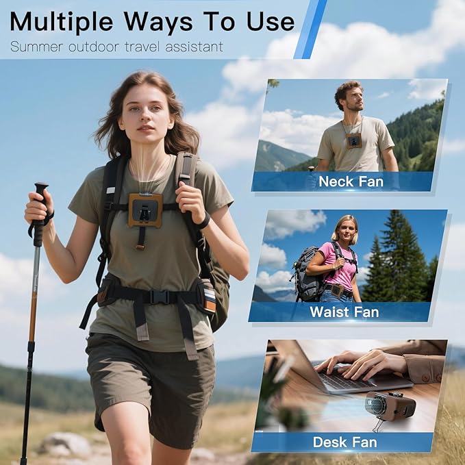 - 【Multiple Functions】This portable personal waist fan,also known as a belt fan or clip fan,is simple to use and can be used as a small desktop fan,neck fan,waist fan,power bank,LED light and SOS light.